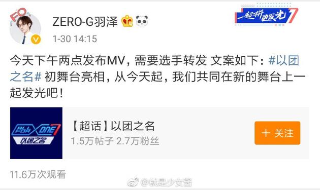 他发道:“今天下午两点发布MV,需要选手转发 文案如下:以团之名初舞台亮相,从今天起,我们共同在新的舞台上一起发光吧!”随后,他编辑修改了文案,并留言解释道:“不是故意的,手滑!”