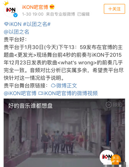新浪娱乐讯 昨天,优酷综艺节目《以团之名》发布选手齐舞主题曲《更发光》,随后有网友质疑,该主题曲与iKON组合的《what’s wrong》高度雷同,有抄袭之嫌。30日,iKON吧官博称《以团之名》主题曲抄袭iKON,并发布微博艾特《以团之名》官博称:“贵平台于1月30日下午13:59发布在官博的主题曲<更发光>现场舞台前4秒的前奏与iKON于2015年12月23日发表的歌曲<what’s wrong>的前奏几乎完全一致。音频对比分析已实属多余,希望贵平台尽快针对这一情况给予说明。”