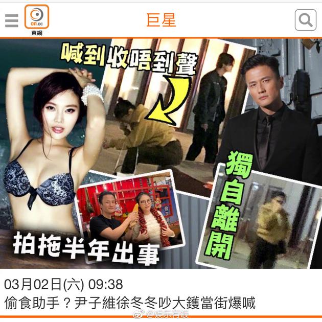 新浪娱乐讯 日前,有网友偶遇尹子维、徐冬冬在便利店门口吵架,照片中,女方坐在路边掩面流泪,男方不予理会,随后女方独自离开,港媒还爆料尹子维疑似出轨女方助理。新浪娱乐向二人工作人员求证,对方否认分手,称是情侣之间小争执,也否认出轨助理之说,因徐冬冬助理系其表哥。
