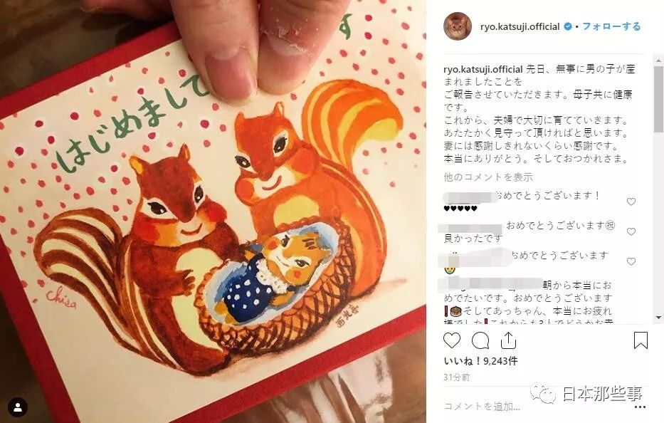 男演员胜地凉 今天通过Ins向粉丝报告了妻子前田敦子 生子的喜讯。