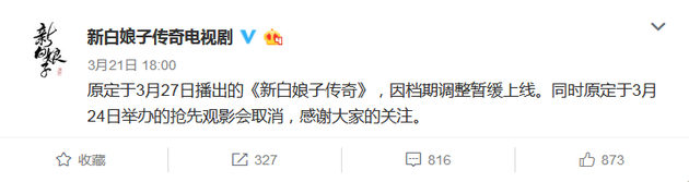 新版《新白娘子传奇》根据1992年版同名电视剧改编,由智磊执导,安以陌担任编剧,于朦胧、鞠婧祎领衔主演,讲述了凡人医者许仙和白蛇白素贞之间千年纠葛情缘的故事,原定于3月27日上线开播。21日晚,官微突然发文,称因档期调整暂缓上线。同时,原定于24日举办的抢先观影会取消。